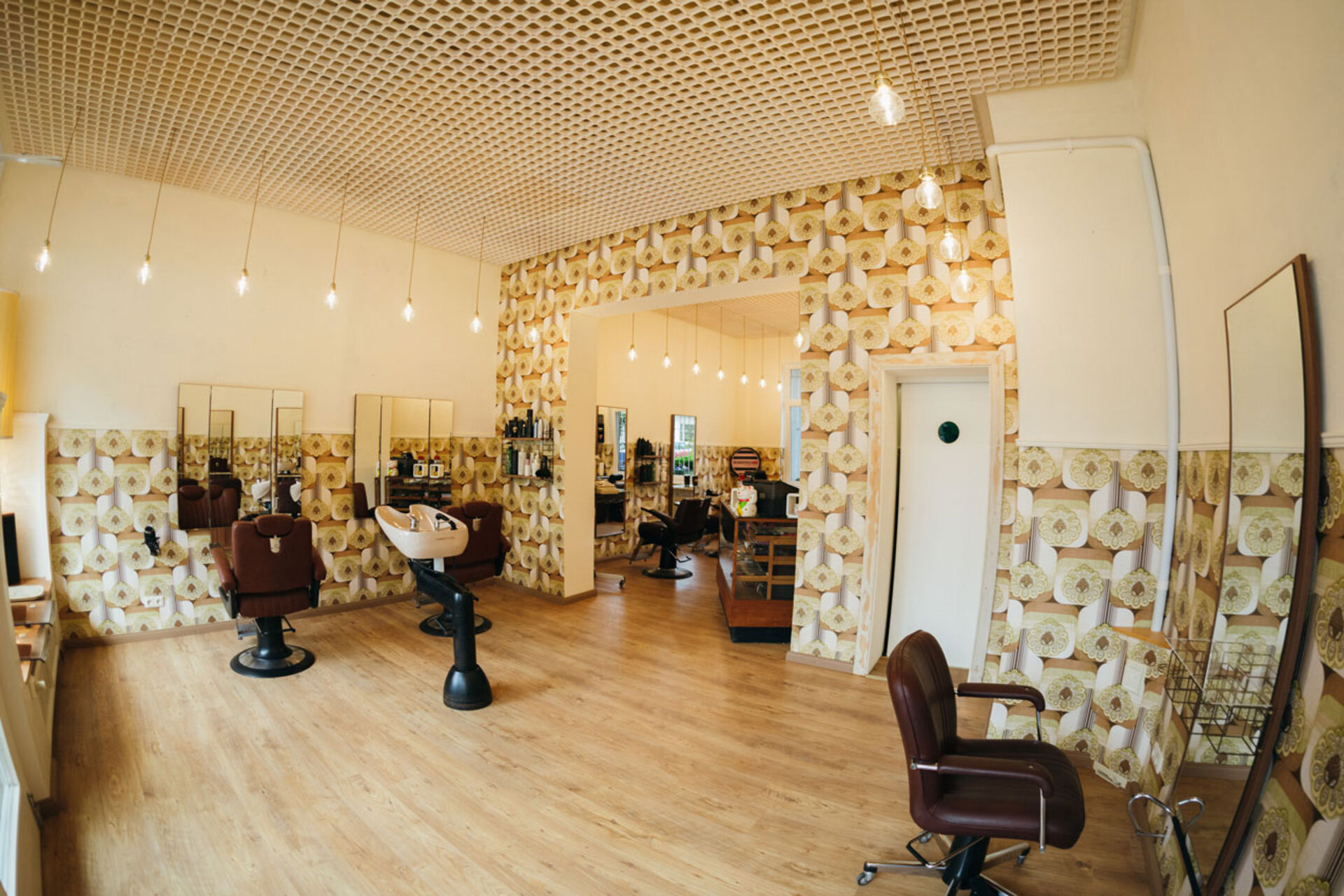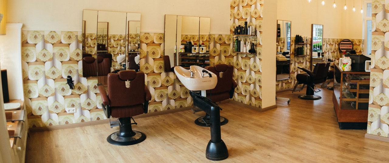 Die Kieler "Frisierstube" bringt absolute Nostalgie-Atmosphäre, verantwortlich dafür sind die Retro-Wandtapeten, die aus dem Entstehungsjahr des Salon-Gebäudes stammt. Erdtöne dominieren und wärmen den Raum. Damit der Raum nicht zu voll wirkt, wurde die Raumgestaltung gekonnt mit viel Licht inszeniert. Die Deckenleuchten sind modern und minimalistisch eingesetzt. Diese Kombination aus Retro-Eyecatchern und reduzierten Elementen lässt den Laden aufgeräumt und nicht zu überladen wirken. Genauso spart das zentrale Waschbassin Raum.