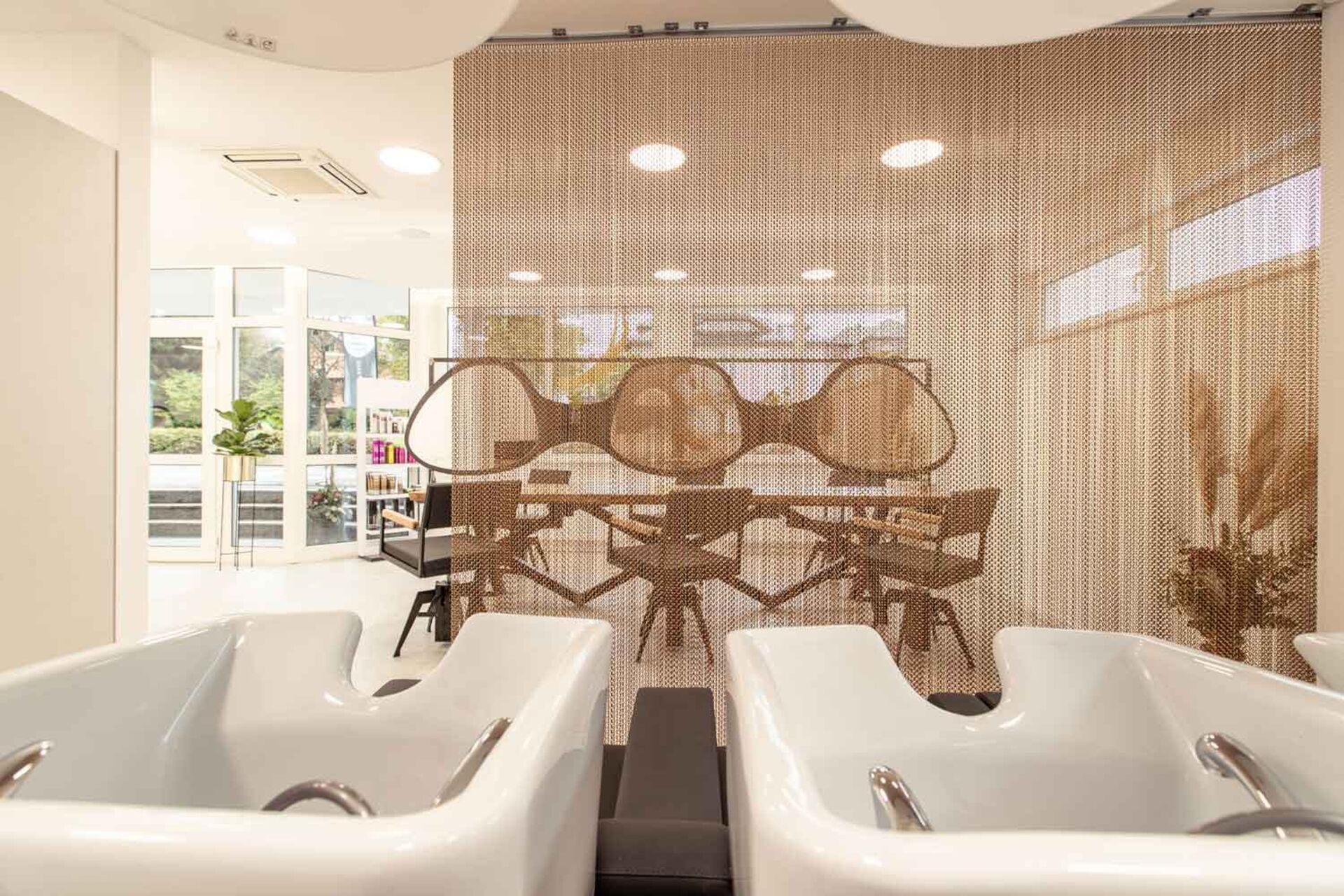 Das helle Innendesign wurde zum größten Teil selbst angelegt. Unterstützung bekamen Eva und David Schwarz und ihr Team von Hermann Gabriel, der auch schon bei den anderen Blickfang-Salons mitgewirkt hatte. Der Wasch- und Mixbereich, genauso wie die Stühle, wurden von dem Inneneinrichter designt.