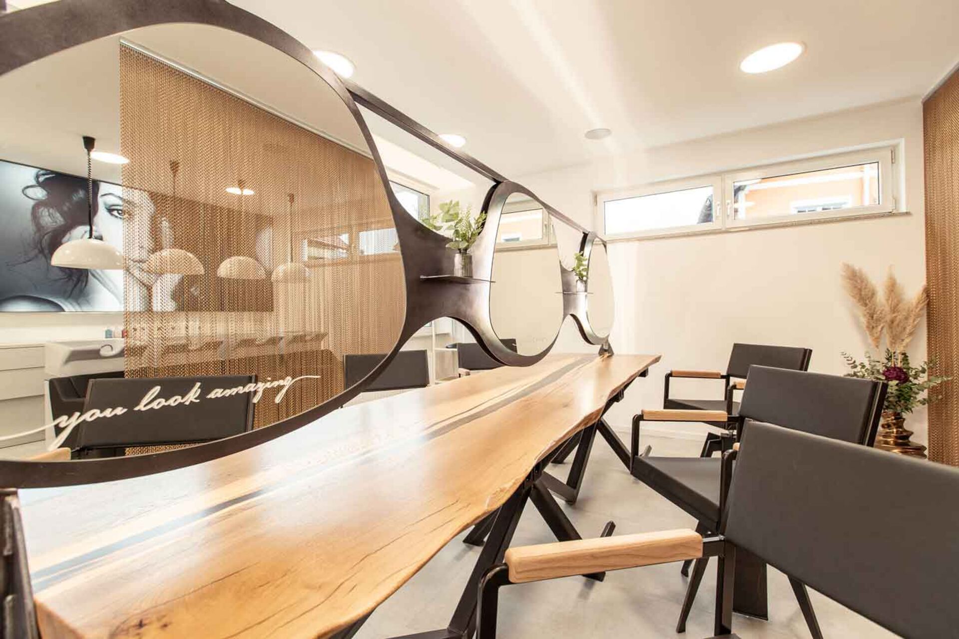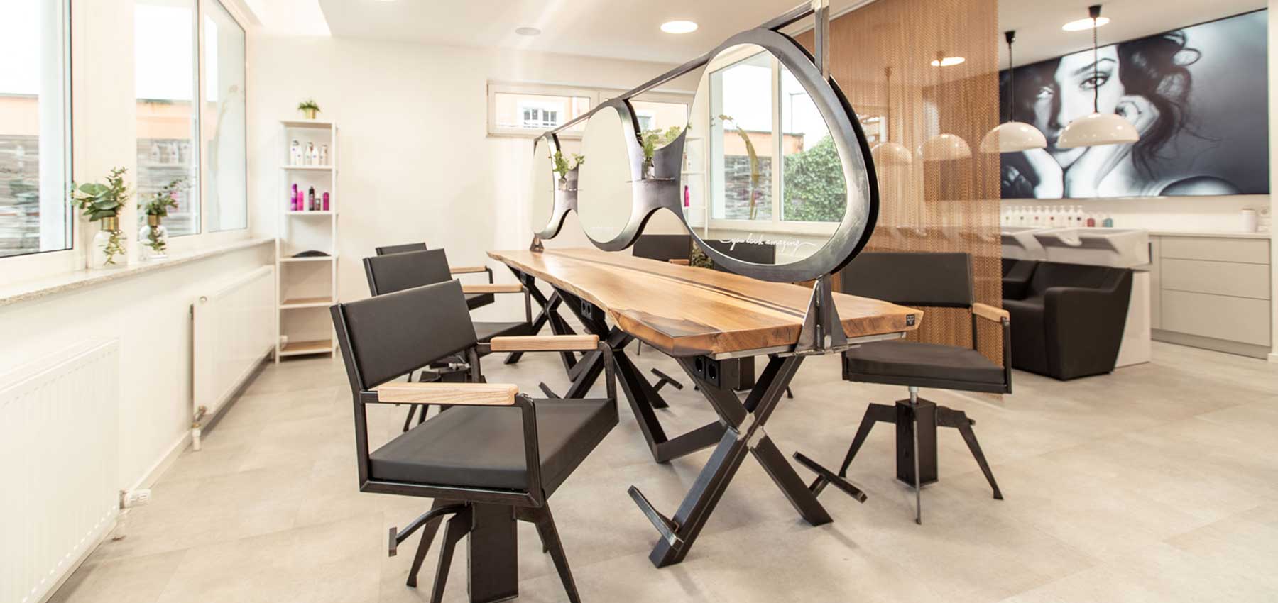 Die Bedienplätze, Rezeption mit Wartebereich und den dreier Frisierplatz wurden gemeinsam mit Dreikant, ein junges Unternehmen aus der Region Salzburg, gestaltet. „Hier war es uns einfach wichtig, etwas anderes zu als die üblichen Friseursalons zu bieten.“, so David Schwarz. Der Baumstamm, der zum Tisch umfunktioniert wurde, war wohl die schwerste Arbeit. „Unsere KundInnen merken schon die Wertigkeit der Materialien!“, freut sich der Salonbesitzer.