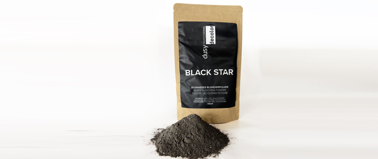 Das schwarze Blondierpulver „Black Star“ von Dusy Professional wirkt dem Gelbstich und Orangestich entgegen. Es schont die Haarstruktur und mattiert das Haar ab. Black Star ist bei Euro Friwa erhältlich.