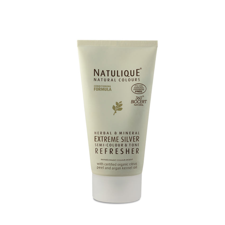 Der Extreme Silber Farbauffrischer von Natulique ist eine nährende Tönung, die für ein kühles, aschiges Blond sorgt. Die Pflegeformel ist mit zertifiziertem Bio-Zitrus-Extrakt und Arganöl angereichert.