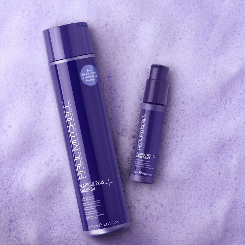 Die neuen Platinum Plus-Produkte von Paul Mitchell beseitigen dank der hohen Dosierung violetter Pigmente ungewollte Verfärbungen im Blond. Shampoo und tönendes Serum kombinieren Neutralisierung, Glanz und Regeneration.