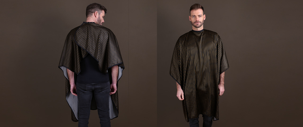 Der schwarz-goldene Schneideumhang Barber Gold von Trend-Design in Nadelstreifenoptik bringt Eleganz und Stil in die Salons. Er ist aber nicht nur ein echter Blickfang, sondern auch äußerst praktisch: Der Umhang bietet optimalen Schutz und Komfort für den Kunden.