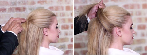 Step 2| Hinter Ohrläppchen beginnend ein diagonales Haarpassé mit den Finger in Richtung Pferdeschwanz nehmen. Dieses Passé schräg an der Oberseite des Pferdeschwanz kreuzen.