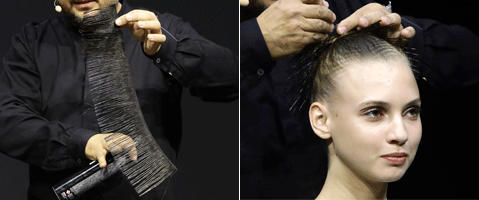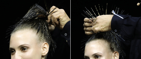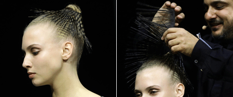 Step 2 | Angelo Seminara hat das Haarband, für den Stachel-Look vorher präpariert. Im nassen Zusand wird es gewachst und noch nass mit 20 Schichten Haarlack besprüht.