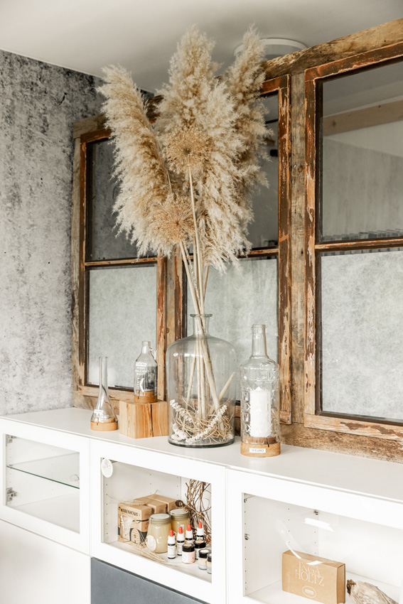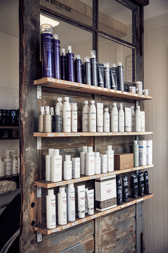 Dabei entstand ein besonderer, übersichtlicher Arbeitsraum, dem aber nichts an ästhetischem Design fehlt. Beim Interior wurden alte Elemente wiederverwendet, die bei der Wohnhaus-Sanierung weichen mussten. So sind alte Schuppenfenster oder -Türen nun Fixbestandteil der Salon-Inneneinrichtung. Auch eine alte Werkbank wurde zur Ablage für Kundinnen und Kunden umfunktioniert.