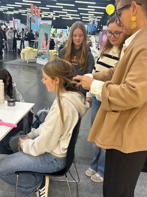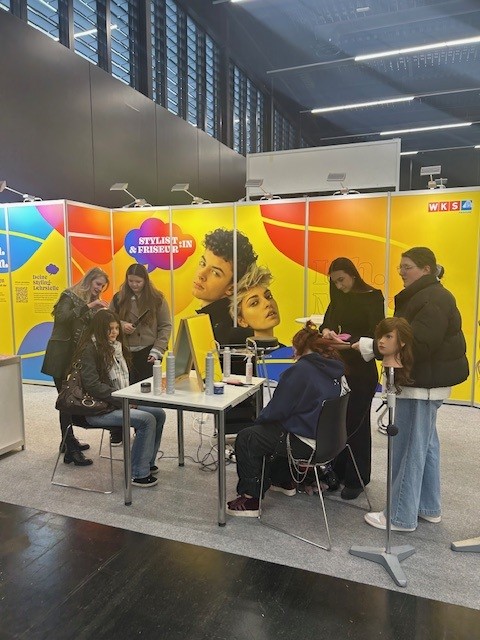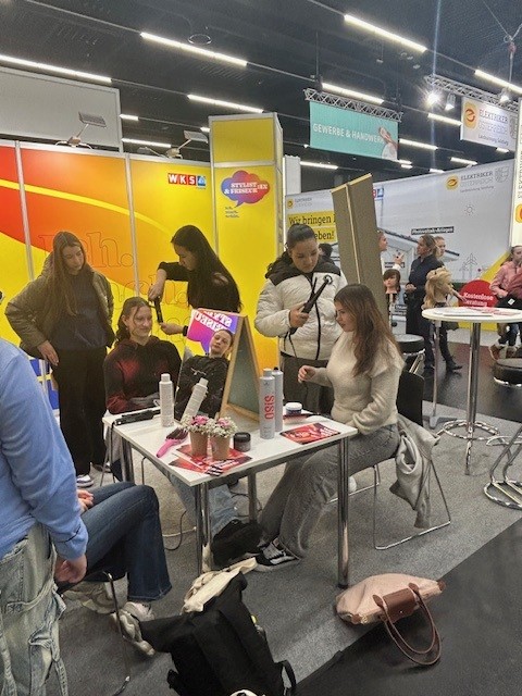 Am Stand der Innung herrschte durchgehend reges Treiben: Schülerinnen und Schüler nutzten die Gelegenheit, das Friseurhandwerk live zu erleben – Flechten, Stylen, Fragen stellen. Kolleginnen und Kollegen aus Ausbildungsbetrieben sowie FunktionärInnen der Innung zeigten praktische Arbeiten vor, erklärten Ausbildungswege und motivierten die Jugendlichen, Stylings bei sich und anderen auszuprobieren.
