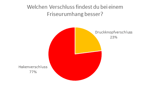 Die imSalon-Umfrage zum Thema Friseurumhänge hielt einige Überraschungen bereit. Zum Beispiel wünschen 25% der teilnehmenden Friseure einen Druckknopfverschluss anstelle eines Hakenverschlusses. Was ist denn üblich?