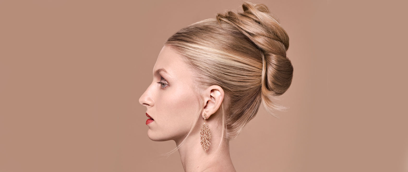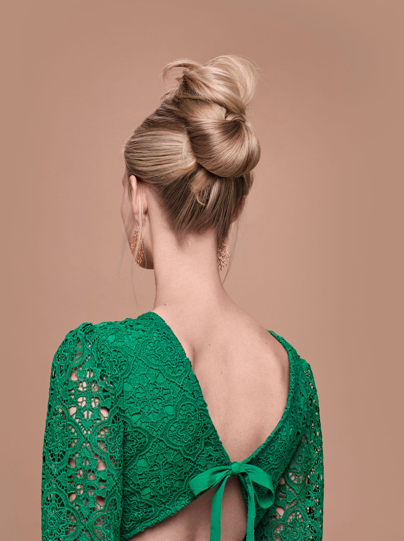 Step 1: Die Haare am Hinterkopf etwas antoupieren und zu einem Zopf zusammenbinden. Wichtig hierbei: Die Haare z.b. mit Tecni.Art Super Dust Haarpuder griffiger machen.