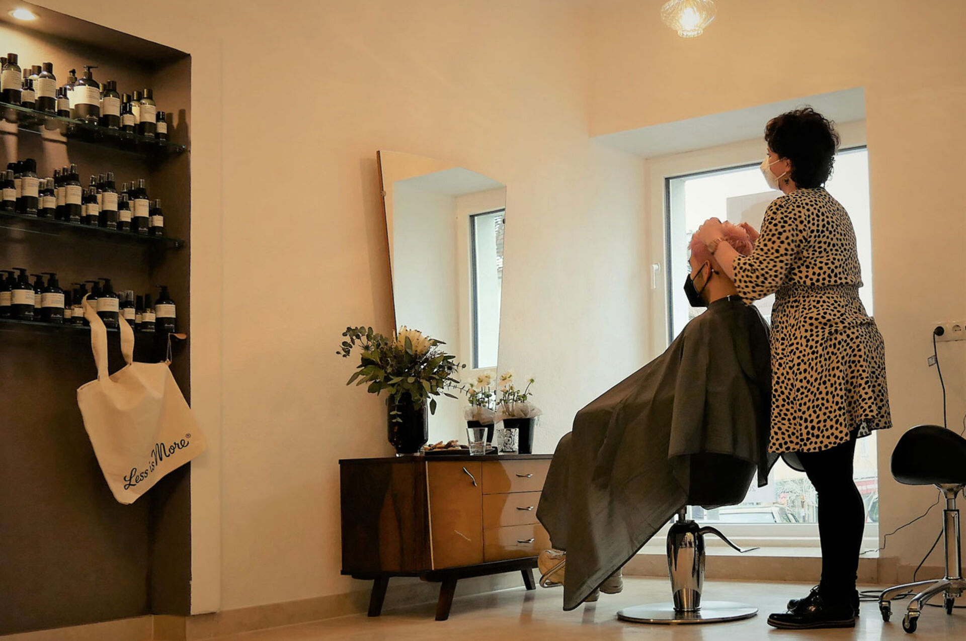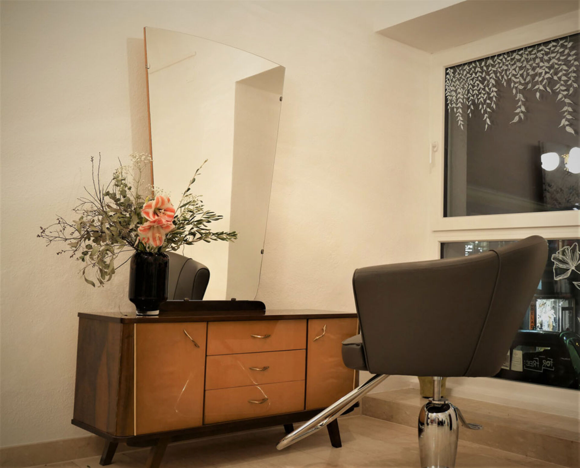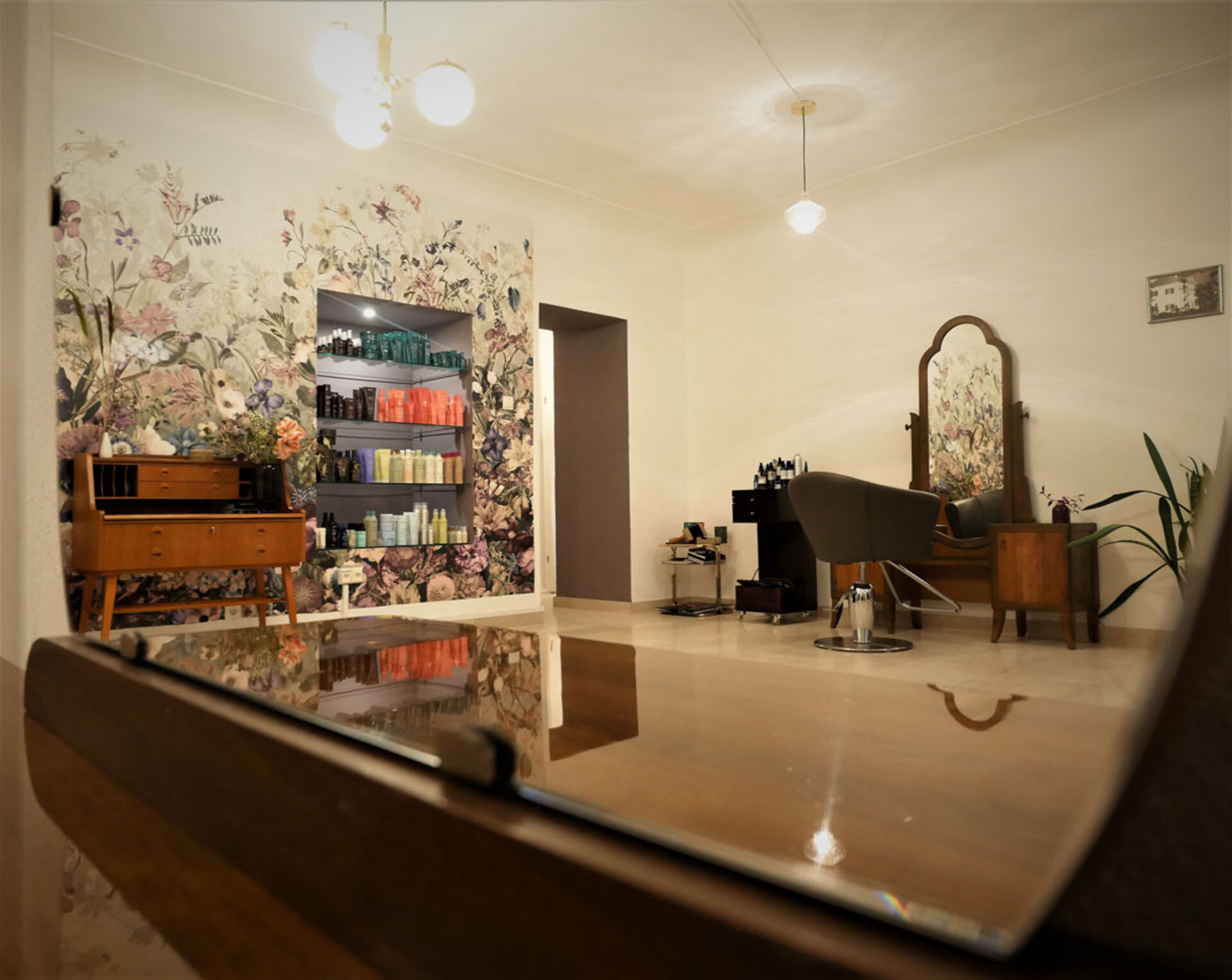 Die Einrichtung hat Saloninhaberin Martina Zink auf Secondhand Plattformen gefunden, geschenkt bekommen, in Antiquitätenläden erstörbert oder sogar ersteigert. Die wunderschöne Psyche (Spiegelkommode), in der sich nun die "am Welsplatz"-Kund*innen betrachten dürfen, ist ein Erbstück von der Großtante.