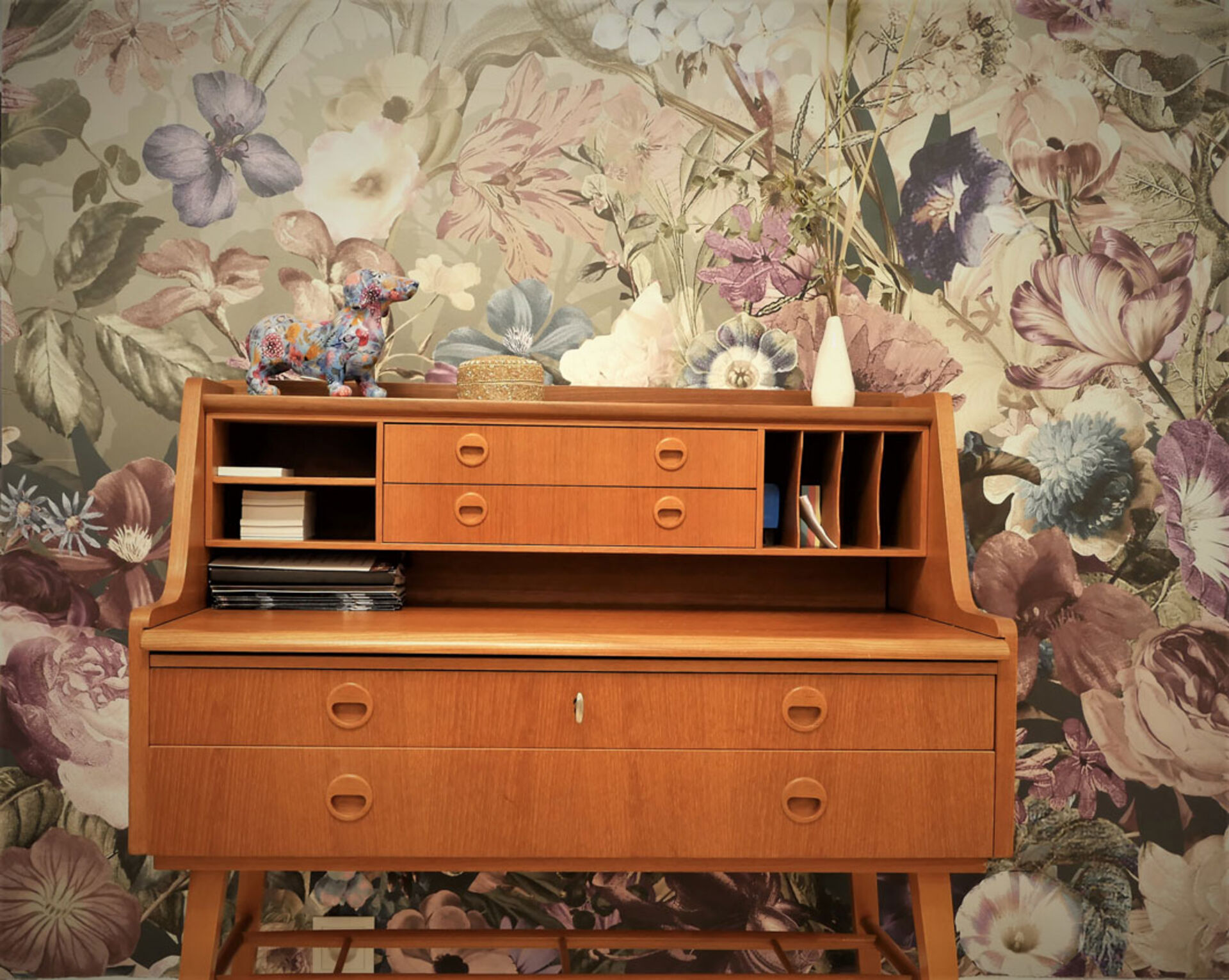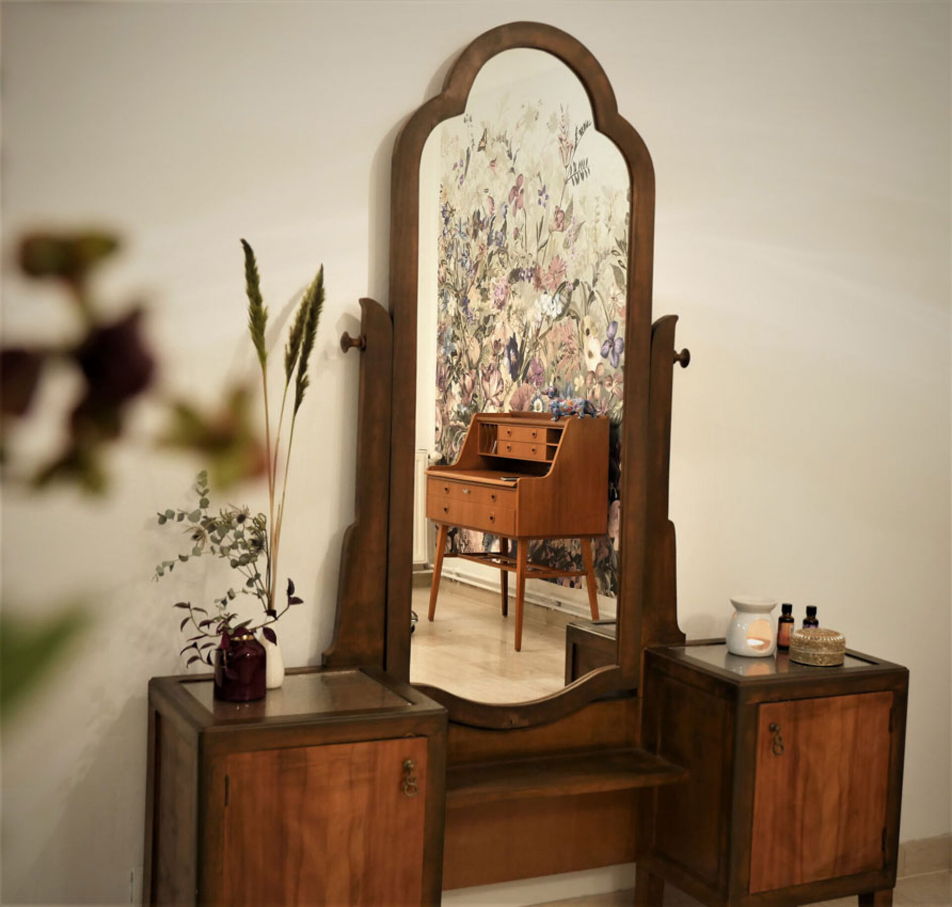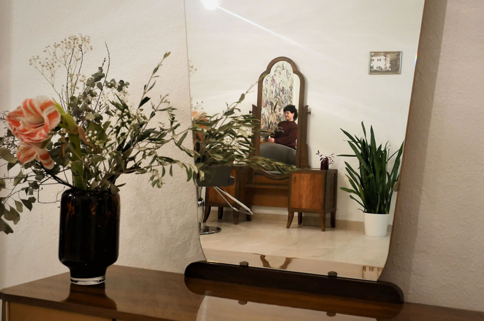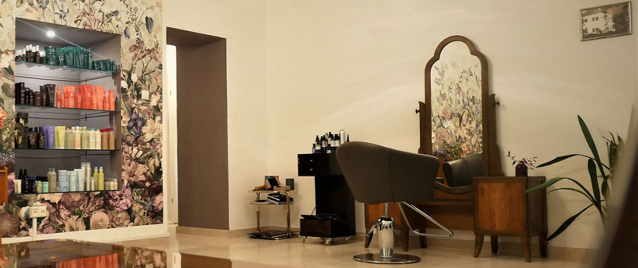 Die Einrichtung hat Saloninhaberin Martina Zink auf Secondhand Plattformen gefunden, geschenkt bekommen, in Antiquitätenläden erstörbert oder sogar ersteigert. Die wunderschöne Psyche (Spiegelkommode), in der sich nun die "am Welsplatz"-Kund*innen betrachten dürfen, ist ein Erbstück von der Großtante.