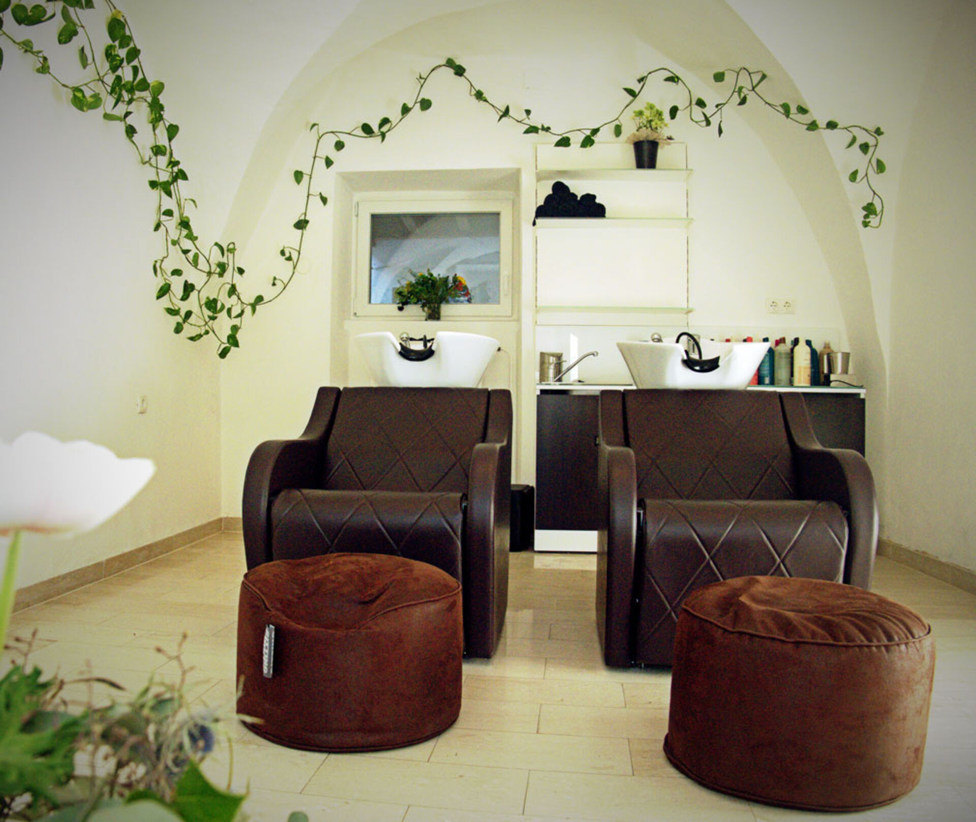 Angenehm ist auch der Waschbereich gestaltet: Platziert im wunderschönen historischen Gewölbe lädt dieser zum Ankommen ein. Mit der grünen Pflanze sind Ruhe-Oase Vibes inklusive. Besonders sind die eindrucksvollen Kreidemalereien an den Schaufenstern. Salon-Inhaberin Martina Zink ist nicht nur Friseurin, sondern auch Künstlerin. Sie erstellt die Glasmalerei selbst und erneuert die Kunstwerke regelmäßig, den Jahreszeiten angepasst.