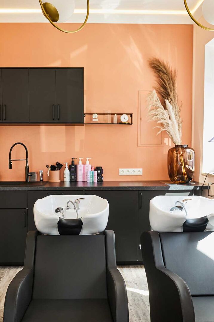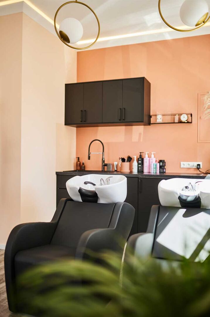 Dazu bilden schwarz-weiß Kontraste, wie eine Streifentapete im Durchgang, oder schwarze Möbel und Dekoelemente einen frischen Kontrastpunkt. Der dazu kombinierte Sitzbereich für die Kundinnen*Kunden sowie auch der Waschbereich setzen einen weiteren kräftigen Farbakzent und ergänzen stilistisch den hell und freundlich gestalteten Empfangsbereich.