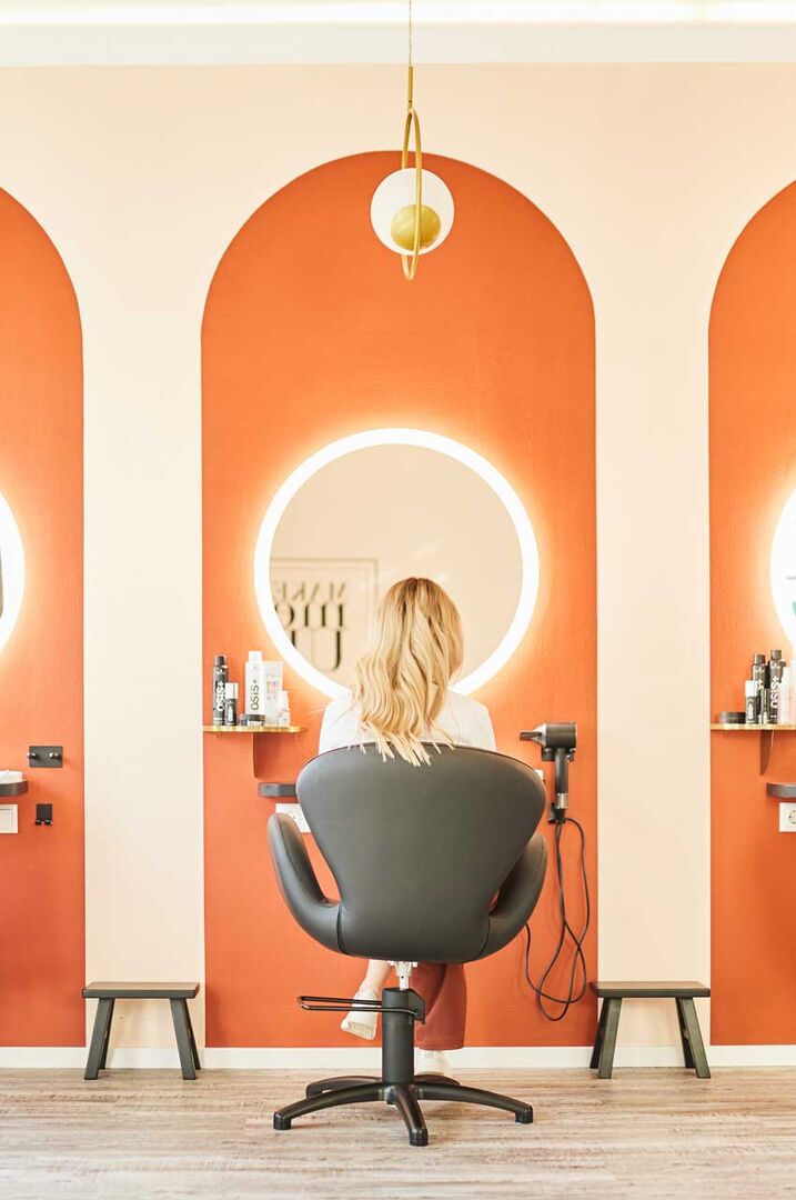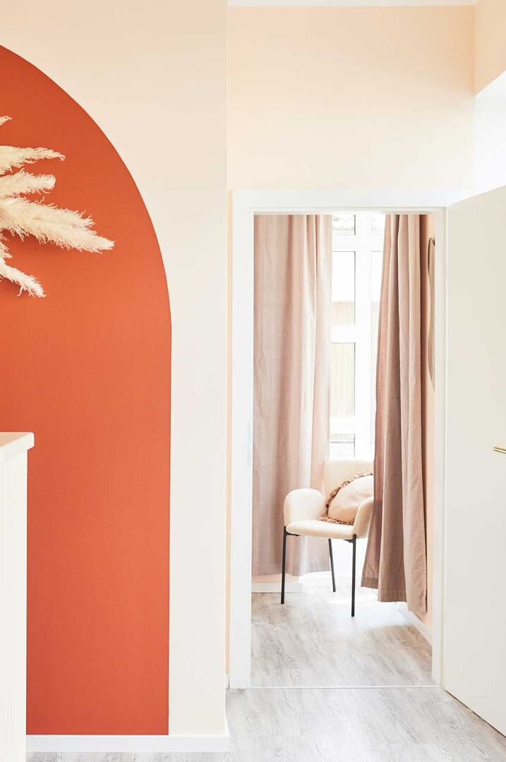 Entspannte Ästhetik, sanfte erdige Töne wie Terracotta und auch Peach sowie natürliche Materialien wurden hier mühelos nebeneinander gestellt und führen gleichzeitig zu einladenden Räumen. Dieses Wohlgefühl umhüllt einen schon beim Betreten des Salons und zieht sich durch alle Bereiche und Behandlungsräume.