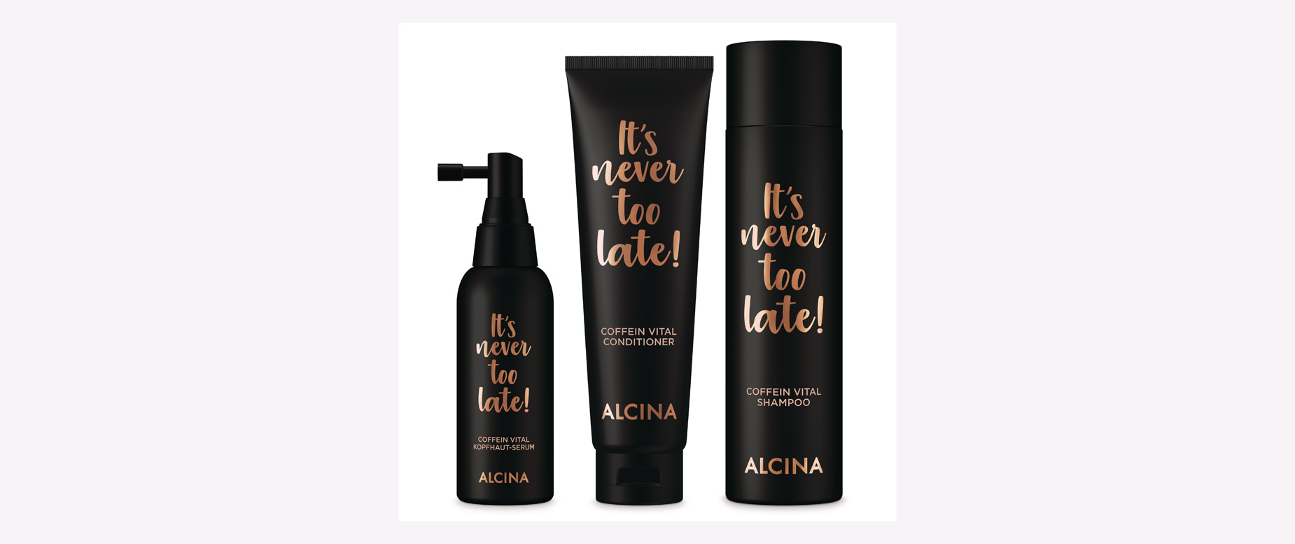 Alcinas It’s never too late Serie besteht aus drei aufeinander abgestimmte Produkte, die gemeinsam dünner werdendes oder zu Haarausfall neigendes Haar stärken sollen: