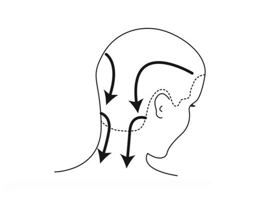 Step 3| Mit Daumen und Handballen bei mäßigem Druck sichelförmig vom Ohr zum Nacken streichen