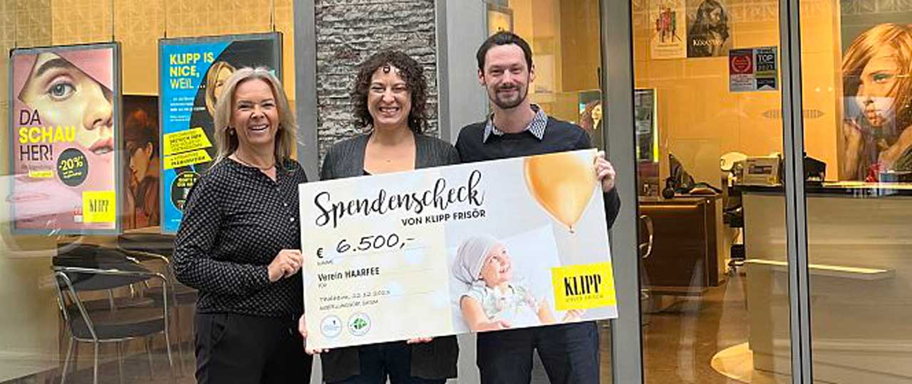 KLIPP Frisör sammelte seit November 2021 mehr als 600 Haarspenden und spendet jetzt zusätzlich noch eine stolze Summe von 6.500 Euro an den Verein. Mit diesem Geld können 13 Perücken hergestellt werden, die kranken Kindern und Jugendlichen zur Verfügung gestellt werden. Auch die KLIPP Kund:innen waren den gesamten Dezember aufgerufen, Geldspenden für diese gute Sache zu übergeben.