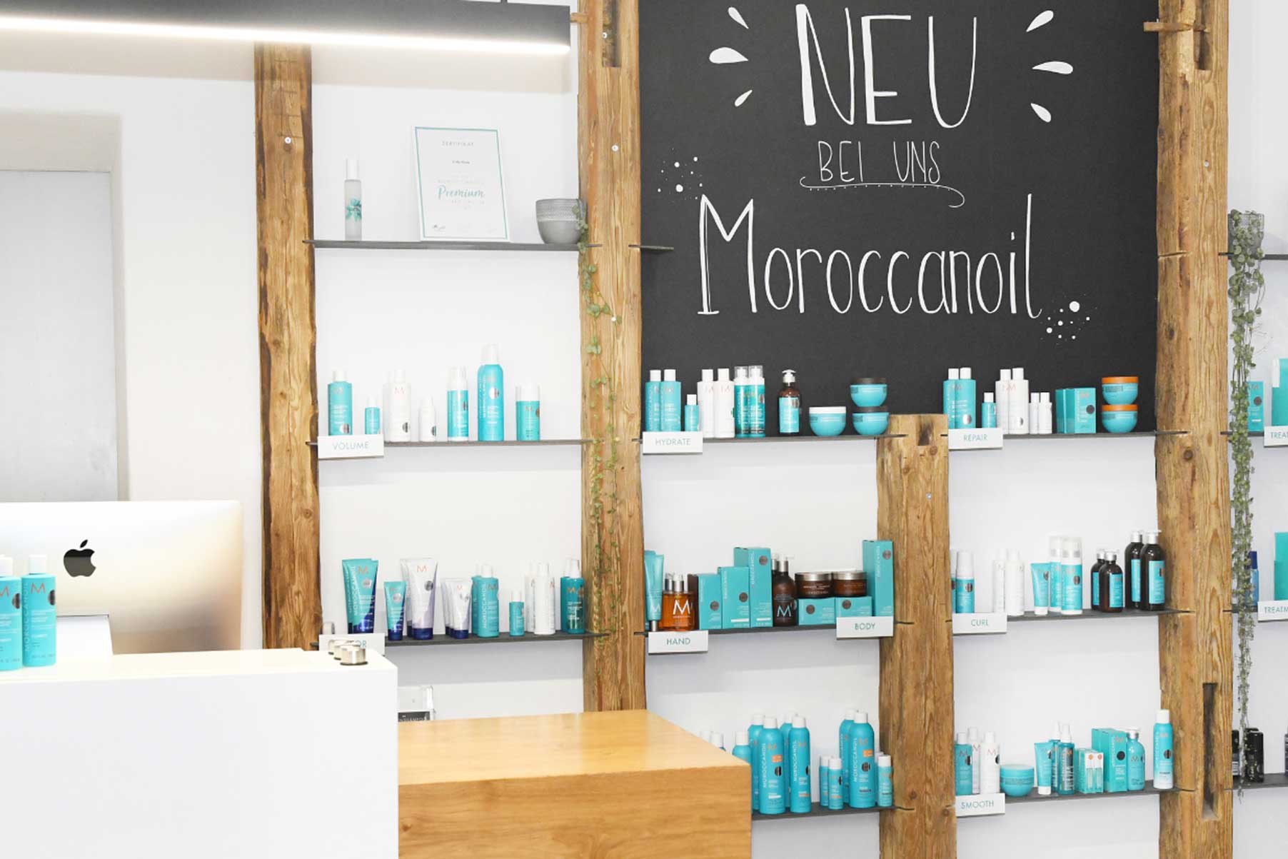 Trotz Holz-Stil wirkt der Innenraum nicht zu überladen und reduziert. Dafür hat sich Erika Ploum mit ihrem Team dazu entschieden, den Produkten genügend Raum zu bieten. Mit Gieseke und ► Moroccanoil als Produkt-Partner sind die türkisen Packagings die bunten „Highlights“ im Salon. Das volle Commitment zur Marke Moroccanoil spiegelt sich auch im Team-Outift – in Form von türkisen Shirts – sowie den Handtüchern in Türkis wider. Beides hebt sich vom sonst farblich schlicht gehaltenem Ambiente besonders ab.