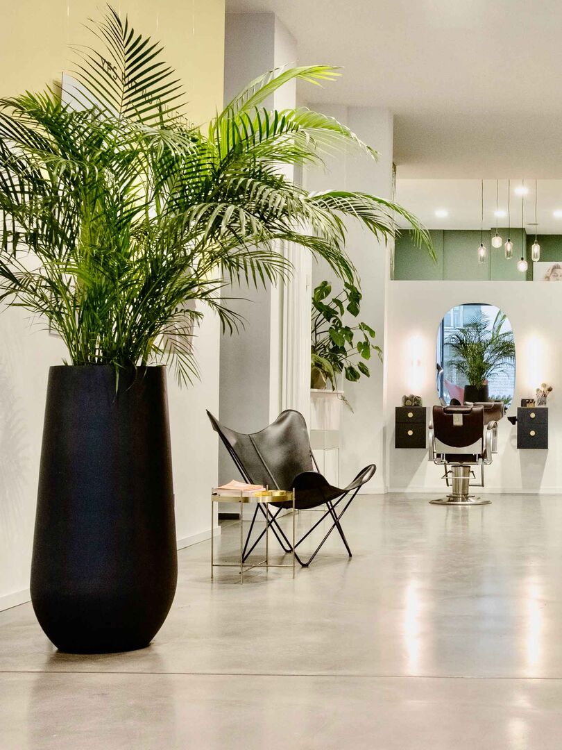 Die dunklen Möbel und schwarzen Leuchtelemente in minimalistischem Design verleihen dem Raum Tiefe. Große, schwere Vasen mit abgerundeten Formen und üppige Pflanzen verbreiten trotz hoher Räume eine absolute Wohnzimmer-Atmosphäre.
