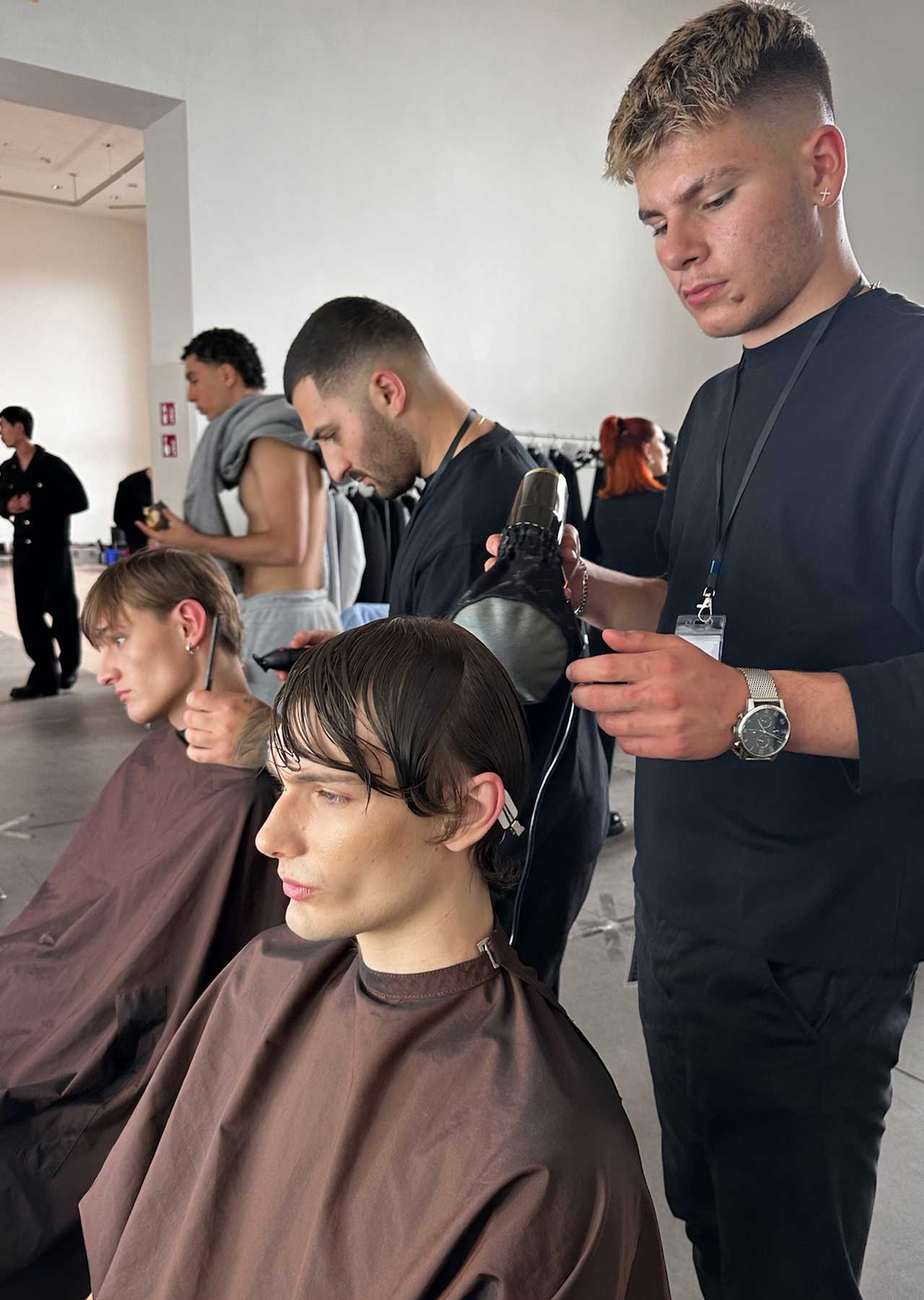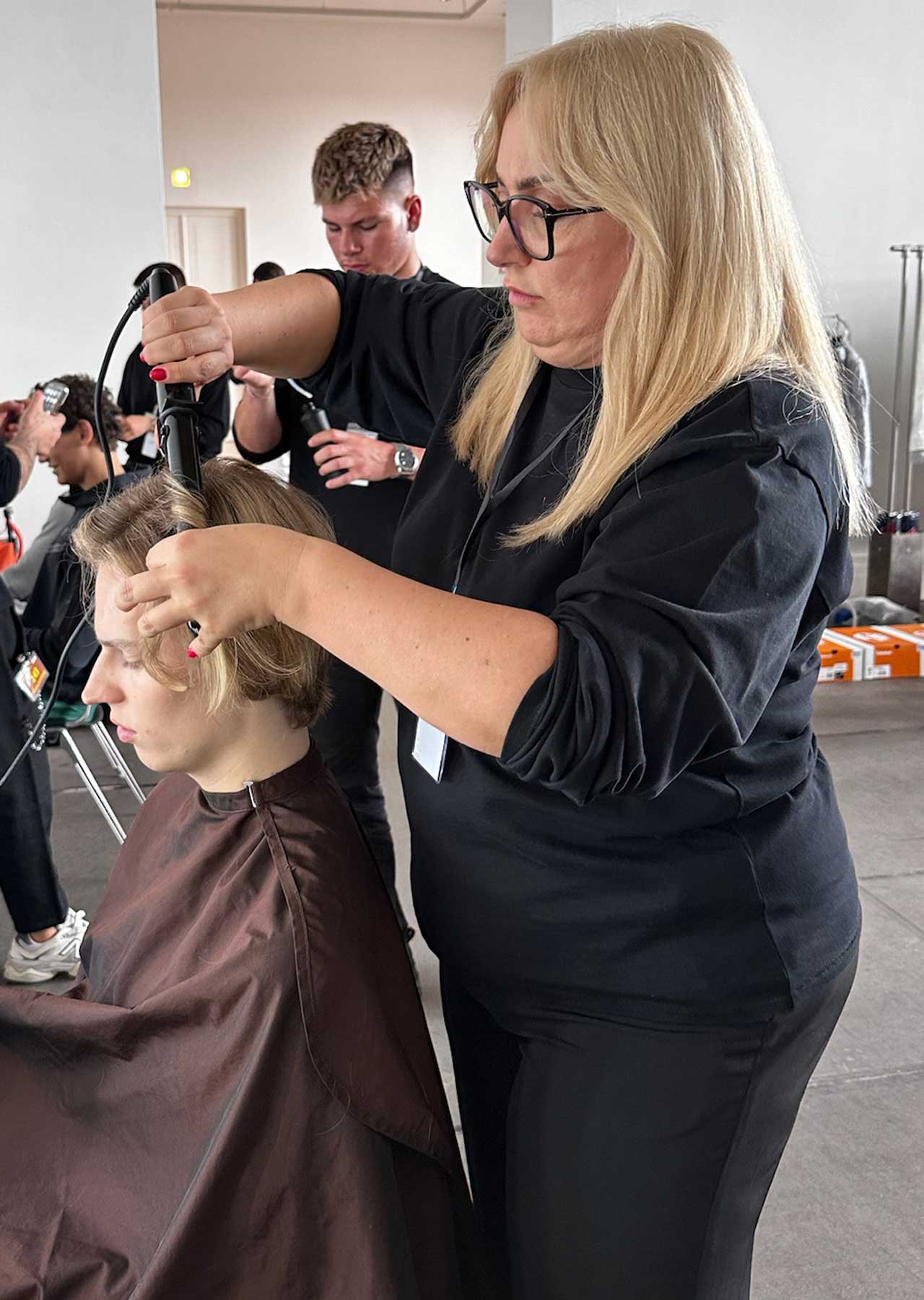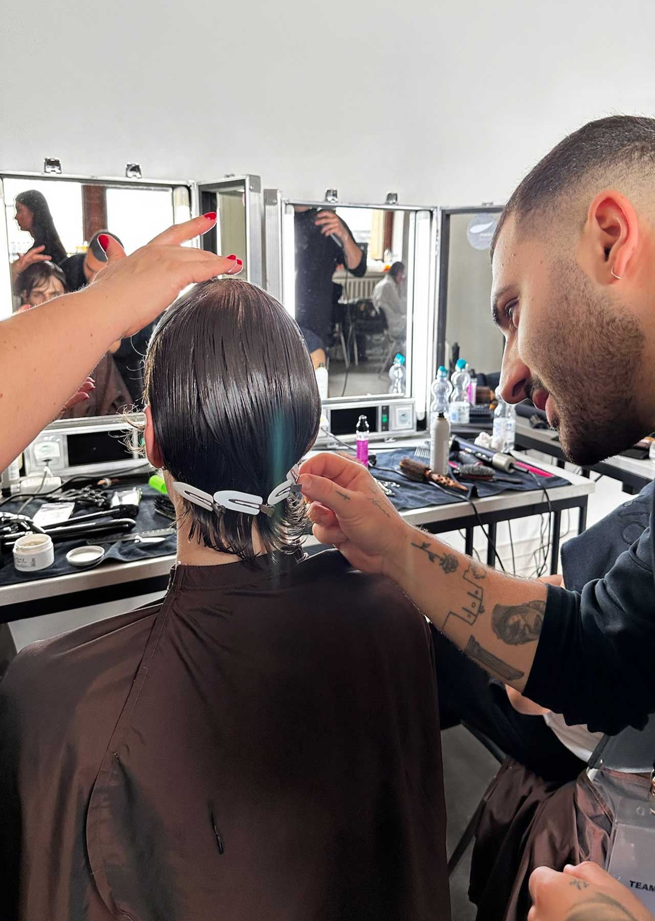 Gemeinsam im Team entstanden Looks Frisuren, perfekt auf die Designs von Alan Balletshofer abgestimmt. Mit hochwertigen Tools kreierten sie präzise und innovative Looks, die die klaren Visionen des Berliner Designers zum Leben erweckten.