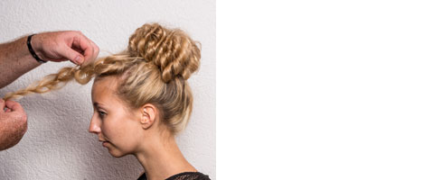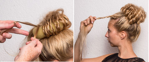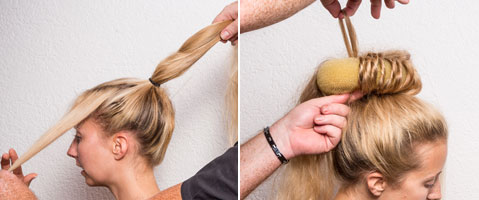 Step 2| Über den Zopf ein Ring-Haarkissen legen und hier dünne Strähnen abteilen, jede Strähnen zwirbeln und die gezwirbelte Strähne locker von Außen nach Innen durch das Kissen schlingen.