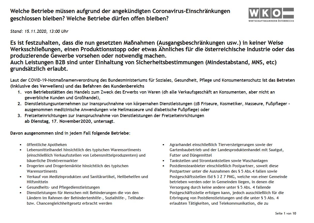 Am späten Samstag Nachmittag wurde die erneute Schließung der Friseursalons im Zweiten harten Lockdown verkündet. Am gestrigen Sonntag dann Details, erst zu den Corona-Hilfsmaßnahmen und finanziellen Unterstützungen für Unternehmer und dann am späten Sonntag-Nachmittag die detaillierte Kriterienliste der WKO.
