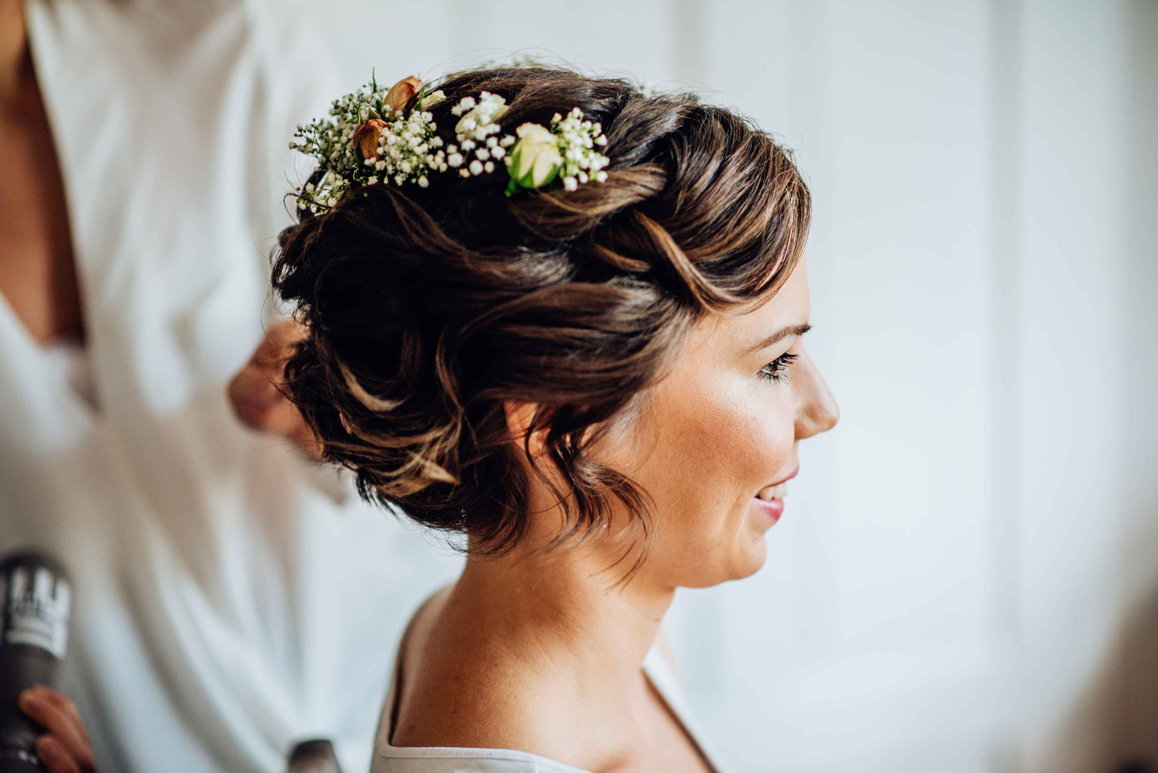 Romantisches Strandhochzeitsfeeling kann bei Kurzhaar mit Beach-Waves geschaffen werden. Elegant und glamourös sieht die Brautfrisur mit Wasserwellen aus. Wellen bieten eine Vielzahl an Möglichkeiten für Kurzhaar-Bräute. Bei einem Schnitt, bei dem nur die Stirnpartie länger gehalten ist, kann diese mit einem Glätt- oder Lockeneisen bearbeitet werden. Der Kreativität sind keine Grenzen gesetzt. Akzente können auch hier mit Haarreifen, Flower-Crowns oder anderen Accessoires gesetzt werden.