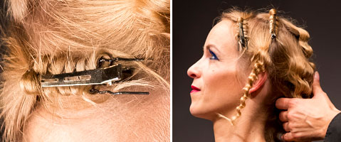 Haare im Zick Zack um große Haarnadeln herum weben.