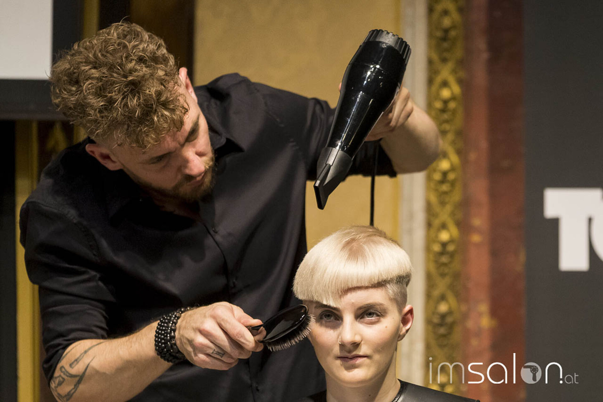 Auf der Bühne: Alex Socher und Jürgen Schwaiger, Toni&Guy Wien und George Mathers, Toni&Guy International Art Director, GB