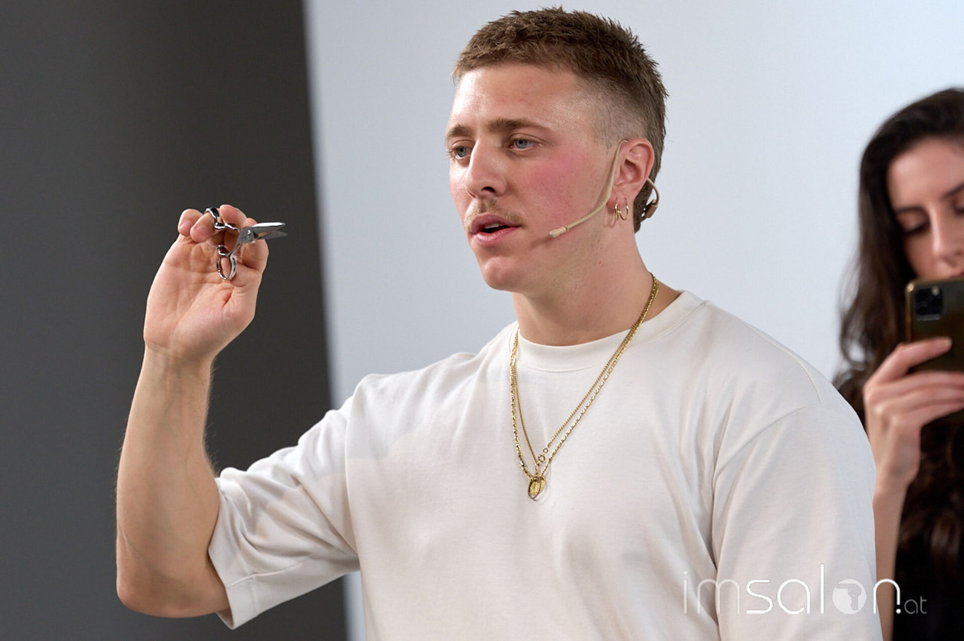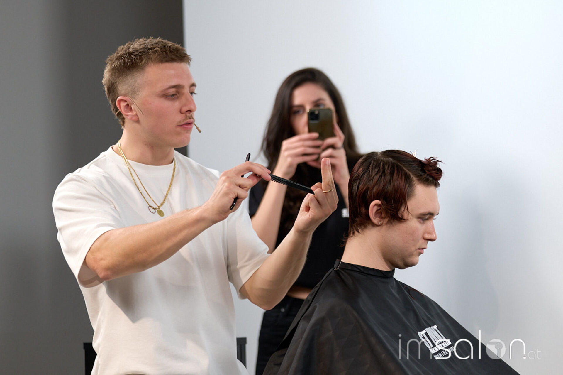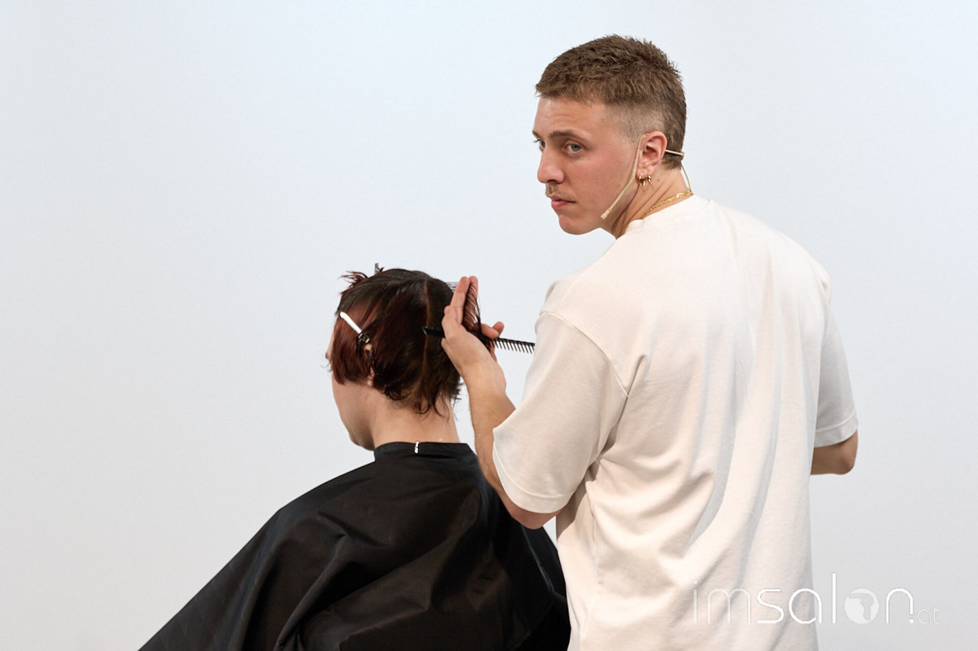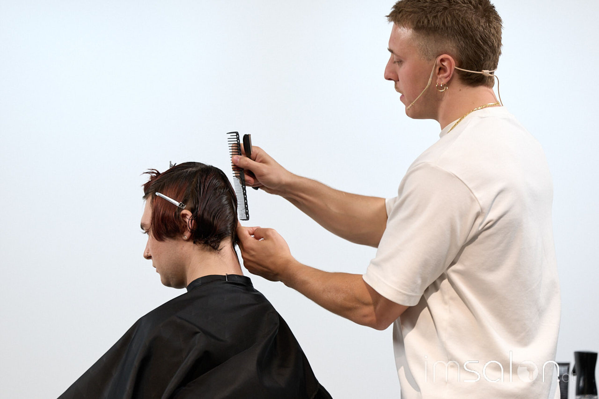 Beim Community Event erarbeitet Andrea Amighetti an drei Modellen drei Haarschnitte: einen Mod Haircut, einen Wolf-Cut, den er eher artistisch interpretiert, und einen Haarschnitt aus der typischen News-School Fading Richtung.