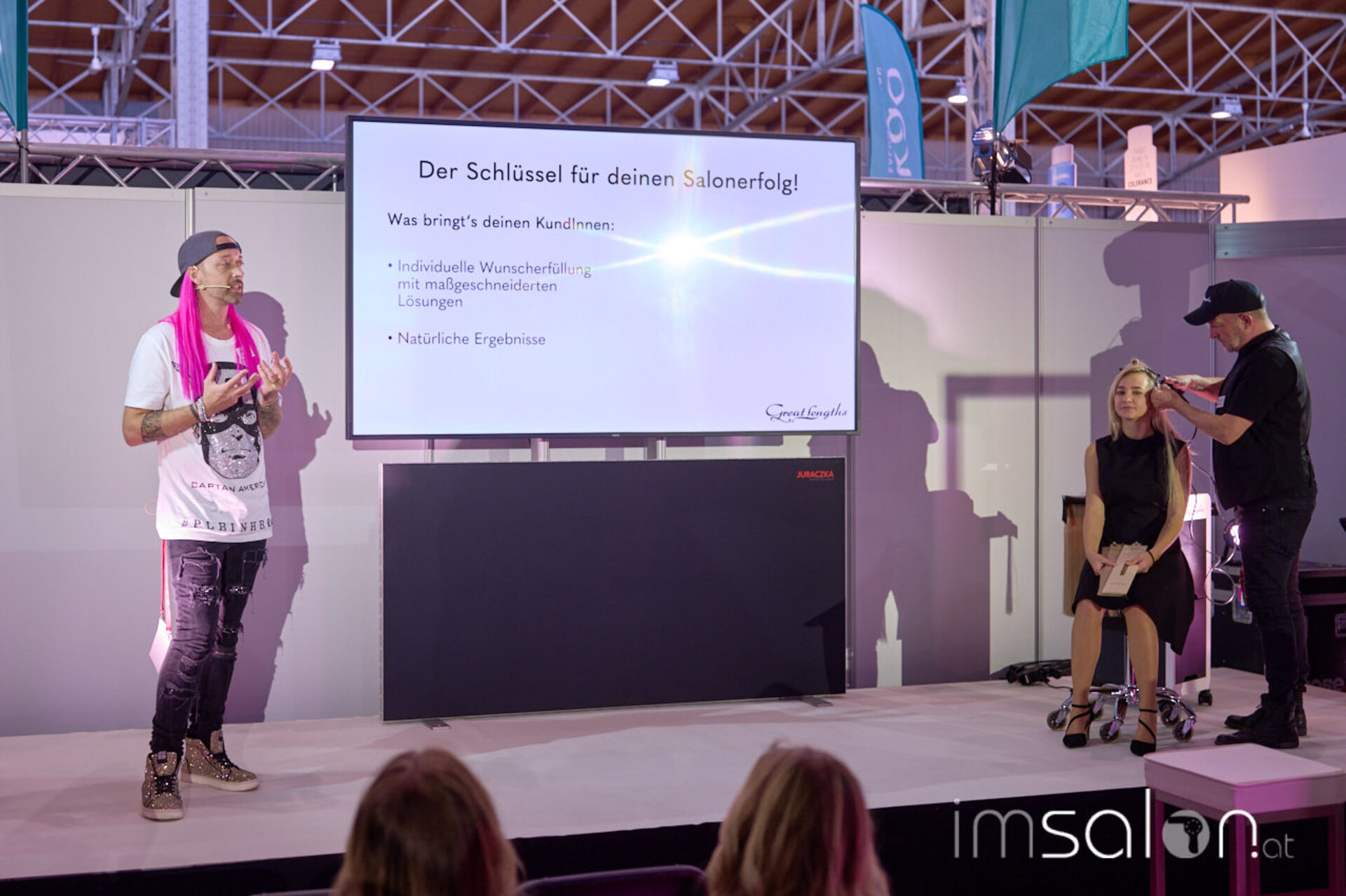 International Davines Artist Kirsten Demant und die Naturaltech-Linie von Davines. Auf der Workshopbühne erklärt und präsentiert die Dänin die vier verschiedene Superactives und deren Wirksamkeit bei brüchigem Haar, Haarausfall und irritierter Kopfhaut. „Die Reihe ist wie deine eigene kleine Cocktailbar, in der du den perfekten Haar-Cocktail für deine Kundinnen mischen kannst“, so Kirsten Demant. Sie zeigt mit Begeisterung auf, was mit diesen nachhaltigen und natürlichen Produkten so möglich ist. An ihrer Seite Anne Huber, die die damit verbundenen Massagerituale nicht als Zusatzdienstleistung, sondern als angenehme Pflicht sieht.
