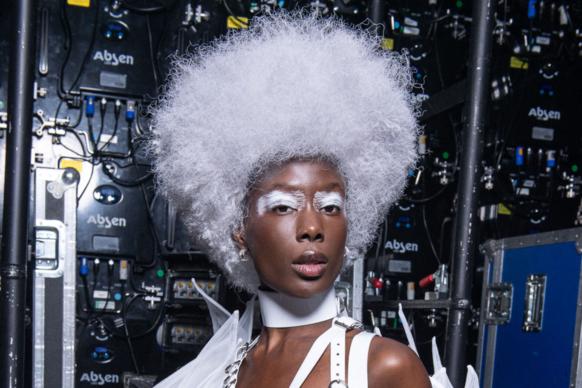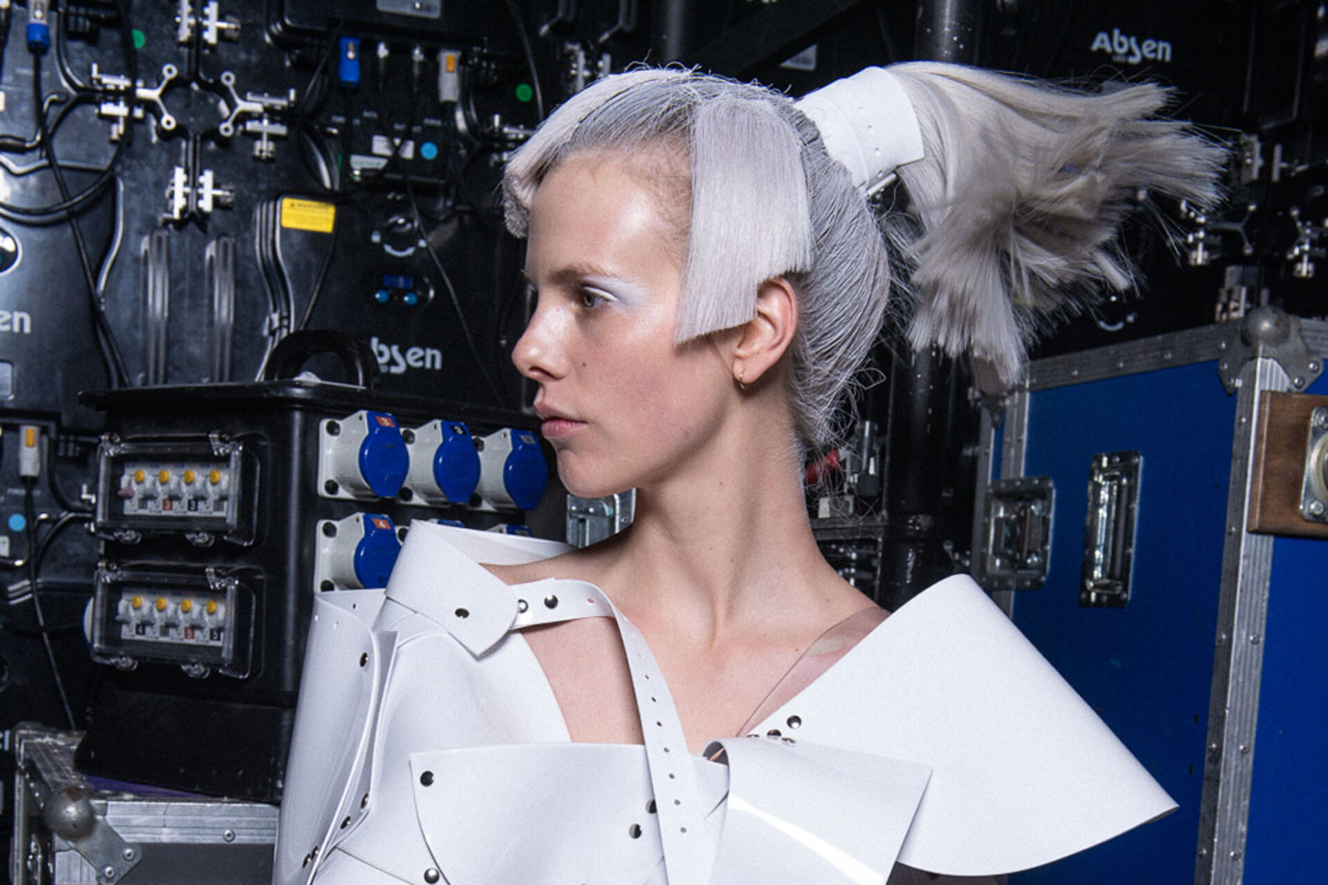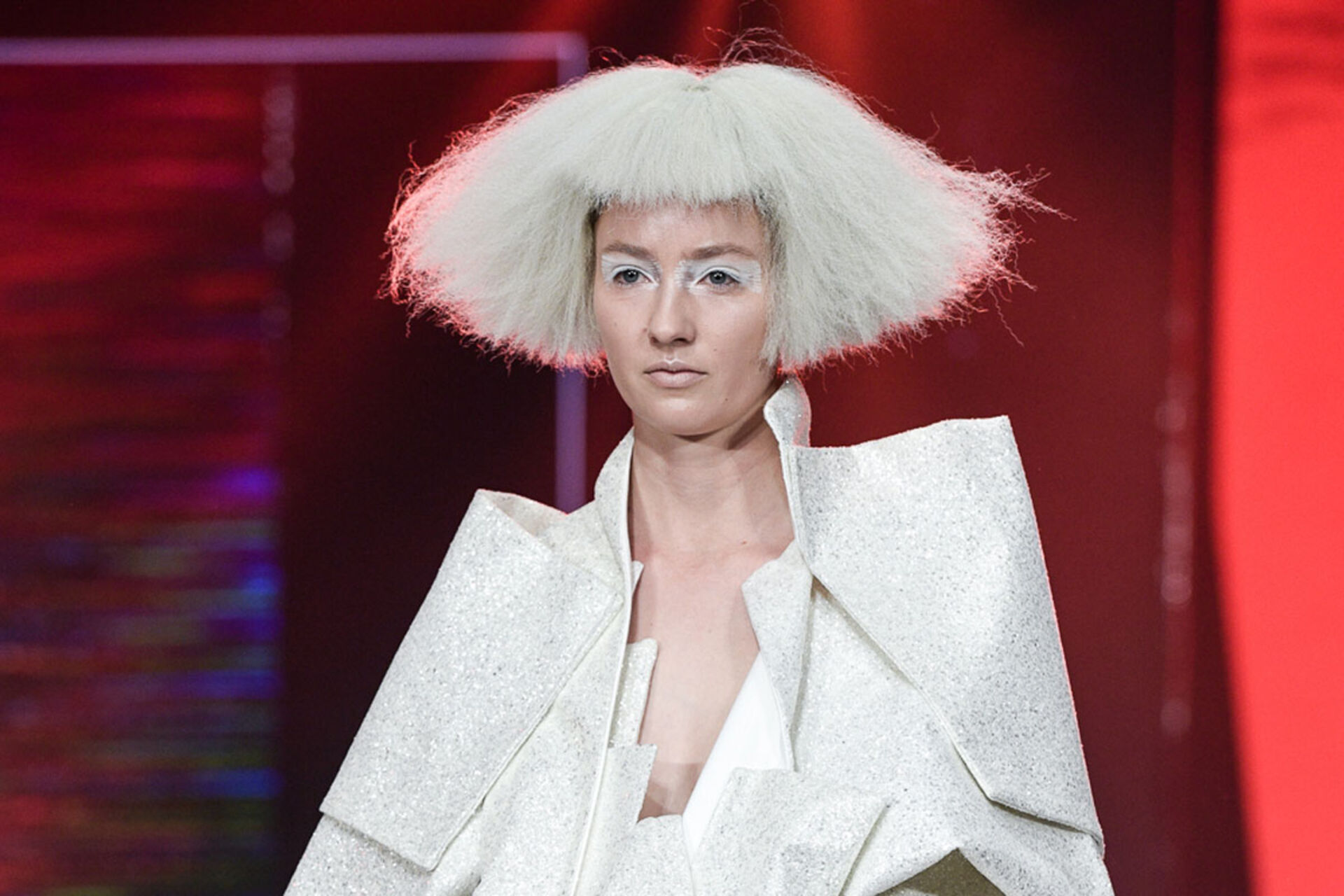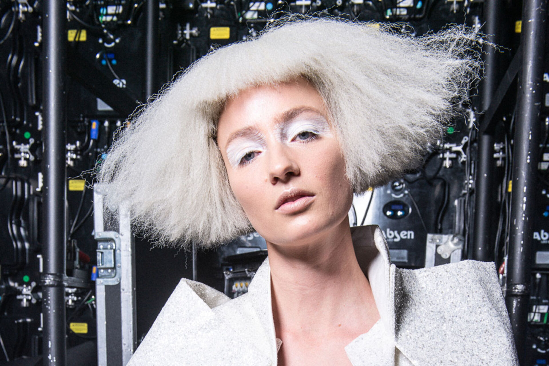 Handwerklich perfekt gearbeitete weißhaarige Perücken, in Form und Textur variierend wurden kontrastiert von Haar in schwarz und metallic Zügen.
