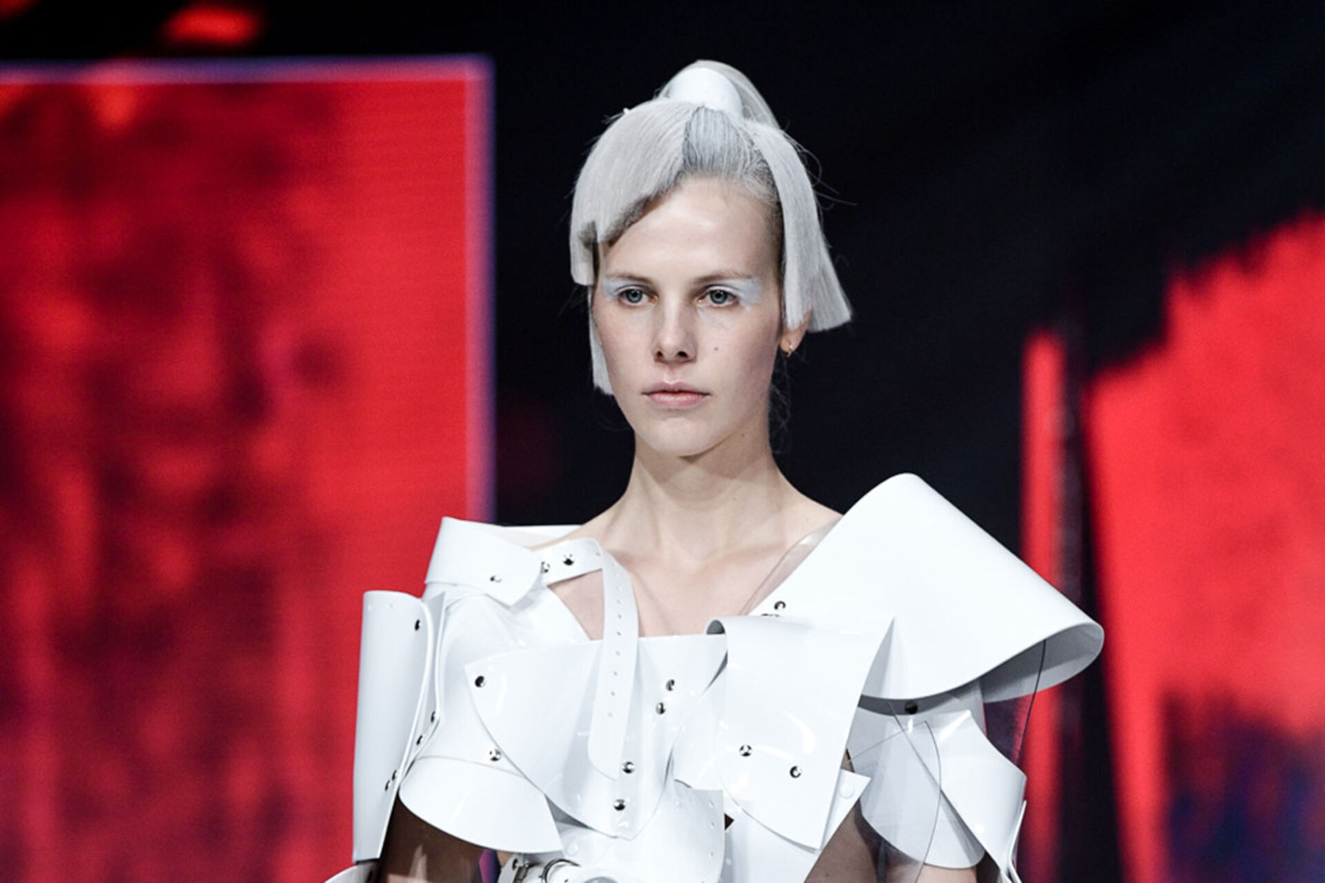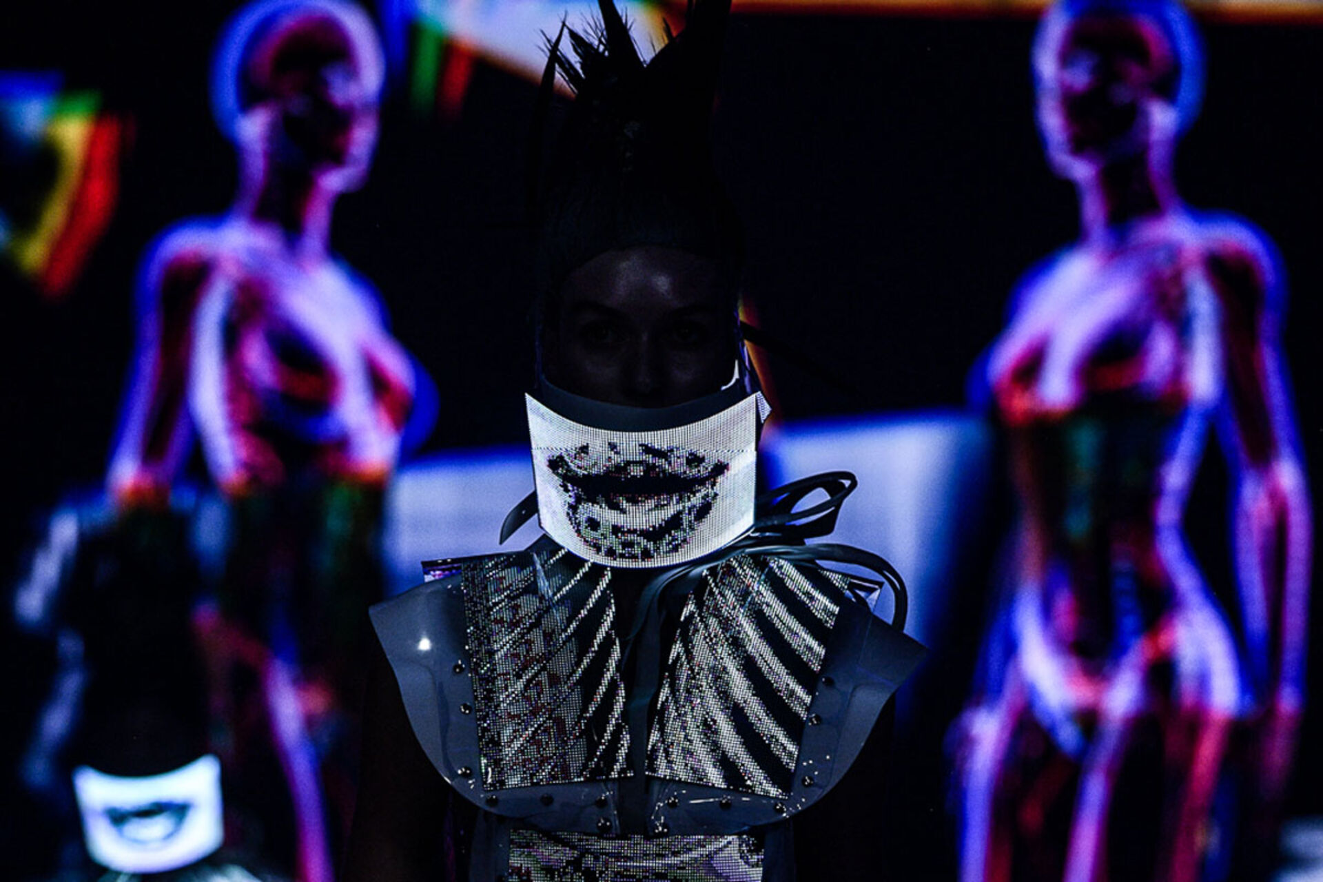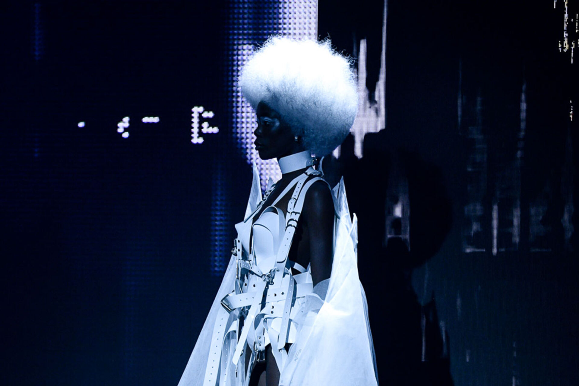 Roboterhafte Schutzanzüge und animierte Screens mit übertriebenen Mimiken als Gesichtsmasken umgehängt verliehen der Show den abstrakten, avantgardesquen Charakter, der zum nachdenken anregte und das Zeitalter von TIGI fuse, der neuen Online Digital Plattform von Tigi einläutet.