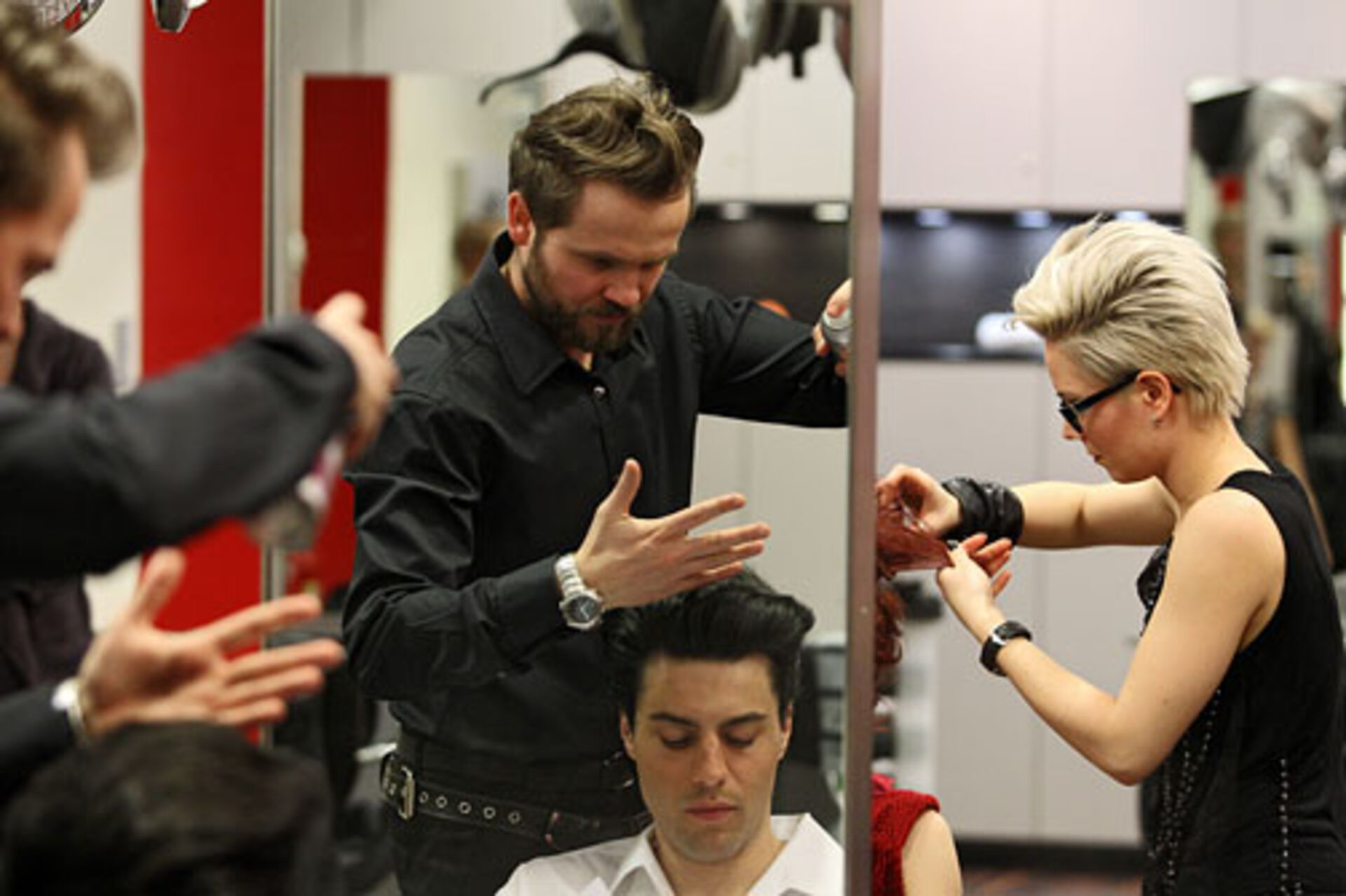 Jens Hagenmüller, Pivot Point Creative Director Deutschland, und Sabrina Holtz, Pivot Point Master Instructor, zeigen im Studio Wien ihre Interpretationen der Trends "Lumina" und "Passionista" in Schnitt, Farbe und Styling.