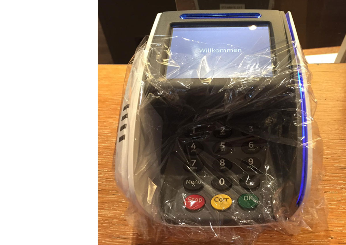 MG: Am Bezahlterminal haben wir die Tastatur abgeklebt und dass sie besser hält, mit Scotch Kleber befestigt. Das Problem ist ja, dass du so ein technisches Gerät nicht so einfach desinfizieren kannst.